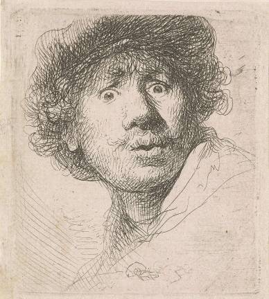 The earliest ones are some of the most affecting, featuring wild, tousled hair and a serious, direct stare (see “Self-Portrait with Curly Hair and White Collar: Bust,” ca. 1630). But his clownish side shines through in the tiny “Self-Portrait in a Cap, Wide-Eyed and Open-Mouthed” (1630), a playful close-up of the artist looking bug-eyed and full of wonder. Both prints were meant to circulate and enhance his reputation.