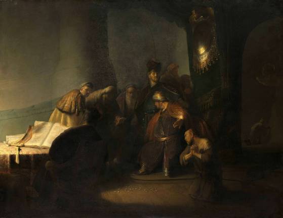 The Dutch master, the son of a miller, was only 23 when he completed the panel, which bears all the hallmarks of his later history paintings: the depiction of an emotional scene; light and shadow; dark colors; expressive faces; expressive hands, which, for Rembrandt, are like faces; exotic costumes; gleaming metals; and, perhaps most tellingly, an asymmetrical arrangement of figures, who lean in to the action.