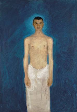 The opening gallery is a showcase for his first homage to himself, “Semi-Nude Self-Portrait” (1902-04), an expressive Christ-like depiction of the artist with a sheet tied around his waist that looks like a loincloth. A radiant blue halo surrounds his head and suggests saintliness.