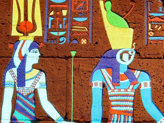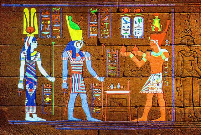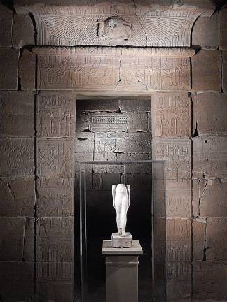Though we’ve come to know them in their monochromatic gravitas, a great many sculptures in antiquity, like those on the temple, were originally painted with ruby red lips, thick locks of dark hair, and whatever was the to-die-for color of current fashion. The practice was meant to make the works more lifelike, more recognizable and relatable. There’s probably no painting that could make falcon-headed Horus seem human, but he’s certainly never looked better.