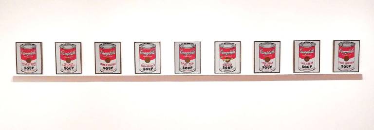 He was also among the first artists to react to a tidal wave of imagery sweeping through America’s consciousness via name-brand advertising, which grew ubiquitous as televisions moved into homes en masse. From this standpoint, the small paintings are monumental. From the standpoint of standalone paintings, they are, as he intended, repetitive. Don’t blame yourself if, after seeing Turkey Noodle, Tomato, Onion and Clam Chowder, you wander, as many visitors did, into the next room where a dazzling group of Marilyns, a towering Elvis and dark and poignant Jackies await.