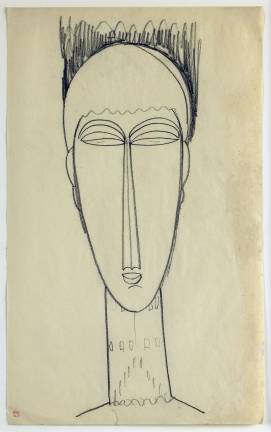 The works on paper are testament to Modigliani’s endless fascination with physiognomy and the “universal condition of both sameness and otherness among people,” Klein said. In the many stylized drawings that are part of the Alexandre collection and that link to the sculpture, we see him hashing out ideas — hairstyles, eyes, eye-brows, noses, lips and ears — in a succession of sketches that explore ethnicity.