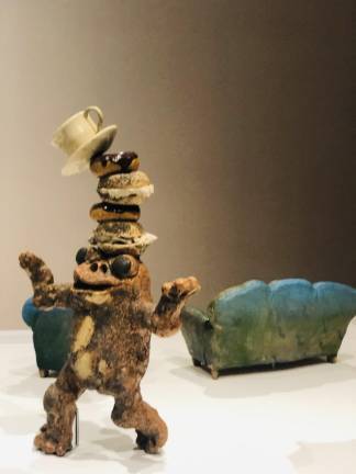 Other works serve a purely aesthetic purpose, like Betty Woodman’s “Indonesian Napkin Holder” (1984), which reimagines an ordinary household item as a large ceramic sculpture, brilliantly glazed in blue, green and yellow.