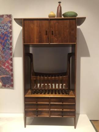 There are more than 70 items on view, with dramatic textile works recently rotated into the show, which also includes furnishings like Sam Maloof’s “Cradle Cabinet” (1968) — a cabinet with built-in cradle and drawers for baby — abstract flowers by studio-glass pioneer Marvin Lipofsky and an abundance of lustrous ceramics from the 1960s Funk movement that blossomed in California’s Bay Area.