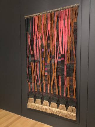 A richly colored piece from Olga de Amaral’s “Woven Walls” series (c. 1969) pushes the envelope in a really great way. She’s “literally opened up the traditional tapestry structure,” the exhibit label reads, by creating long slits and vertical bands that are interwoven, forming a hefty 3D hanging from wool that was hand-dyed and hand-spun by the artist.