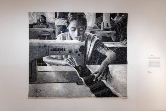 The result is a larger-than-life image of a Bangladeshi garment worker hunched over a sewing machine in a factory, drawing attention to “exploitative labor conditions, the daily reality of craft for people all over the world today,” the exhibit label states.