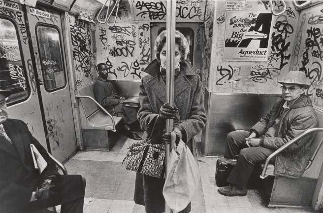 Photo curator Sean Corcoran points to four photos from the go-go Eighties by Richard Sandler that highlight the city’s historic wealth gap. Two picture well-heeled pedestrians on Fifth Avenue — ladies in fur coats and a man and woman in front of Van Cleef & Arpels — the remainder take us below ground to the graffiti-saturated subways. A solitary man reads a newspaper in one image, a woman holds onto a subway pole that obscures her face in another.