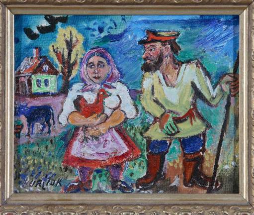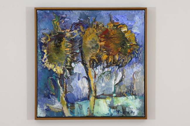 The sunflower — a symbol of Ukraine and now a symbol of peace and resistance to Russia’s invaders — bursts forth in two thickly painted oils by Mikhail Turovsky, “Sunflower Suite 17” and “Sunflower Suite 24” (both undated) and in a framed kilim by Alla Leshko, “Sunflowers” (undated).