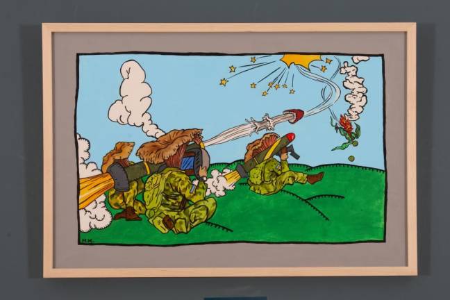 In a press release, the museum states: “The creative pictures drawn by Kravtsov in pencil and painted in vivid colors should not be misunderstood as simple cartoons and illustrations one finds in comic books. The subject matter is serious and representative of the massive assault by Russia on Ukraine and Ukrainian culture. Kravtsov reacts to the unwarranted war and the destruction levied on his homeland in his own inimitable style.”