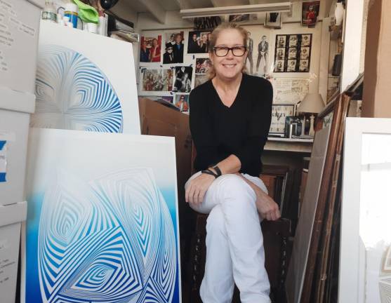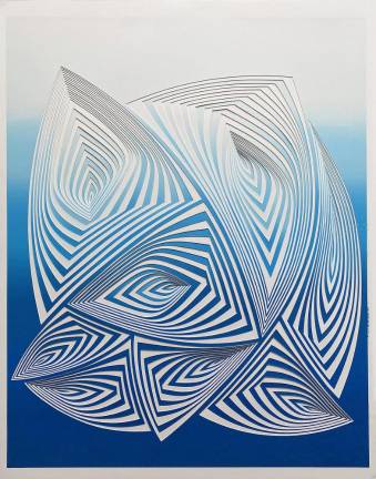 The idea for each emerging pattern “just comes” as she works, says the West Village resident and Parsons School of Design graduate who worked as a fashion designer for many years before returning to her paper artwork more than a decade ago. “You just have to clear your mind and pull the lines,” and be in tune with a sort of meditative aspect to the evolving process, she said. “In the end, it tells a story and brings the viewer into a conversation with the movement of light and color.”