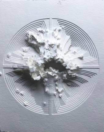Her artwork is unique – free hand-cut paper using no computers or guides. It all starts with one sheet of paper, followed by another placed under it, then another, sometimes just white-on-white, other times infused with silkscreen gradated colors.