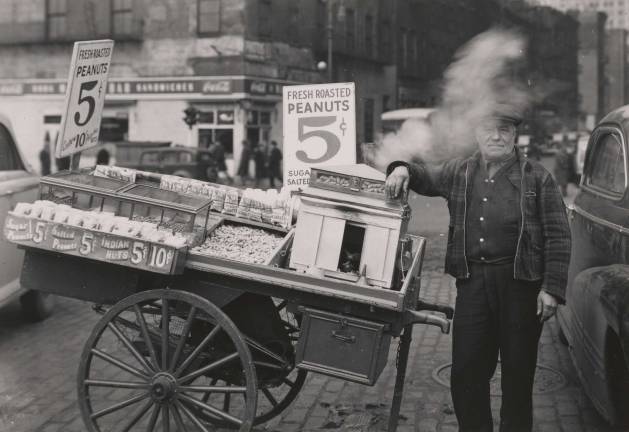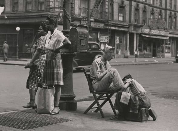 He habitually took a streetcar across 125th street to the east side of Manhattan, where he would hop the Third Avenue El to Midtown, the Lower East Side and the Financial District. He captured images from the top of the El and from under the El. His subjects ranged from a peanut peddler at the Battery (1945) to a man in uniform getting his shoes shined on a street corner in Harlem (1946).