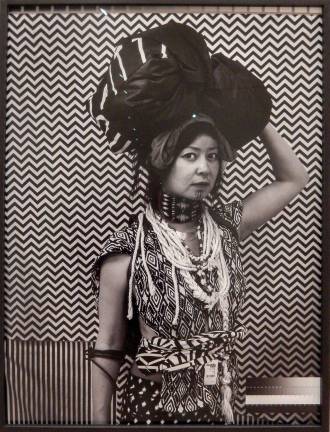 Ethiopian artist Aida Muluneh uses the global tradition of face-painting, here amped up by stark, vivid coloration, to change ideas about the depiction of Africans and African-Americans in photography. Her images are arrestingly beautiful and forceful. Also finding inspiration in traditional African art is Stephanie Syjuco (who, in a nod to Cindy Sherman, dresses up and takes self-portraits). Syjuco riffs on studio portraiture like the work of 20th century Malian master Seydou Keïta, mixing formal poses with densely patterned clothing and backgrounds. But she’s adding a taste of biting social commentary. For her “Cargo Cult” series, Syjuco shopped at big chain stores and shopping malls for clothes, fabrics and accoutrements to don that seemed to express someone’s idea of ethnicity — here, corporate America’s.