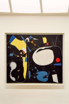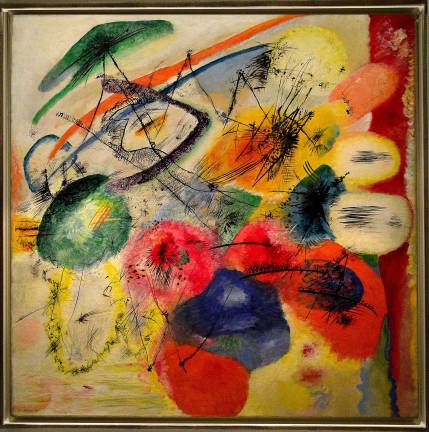 From the lobby, Alexander Calder’s mobile, “Red Lily Pads,” spanning over 9 feet by 16 feet soars overhead, while Vasily Kandinsky’s ebullient “Black Lines” starts the show with clouds of bright color, punctuated by jittery little lines, recalling the way that, within the swell of a symphony, bright notes jump out. One of Kandinsky’s main themes was the relationship of music and art. In his treatise, “On the Spiritual in Art,” the painter wrote, “Colour is the keyboard. The eye is the hammer. The soul is the piano with its many strings.”