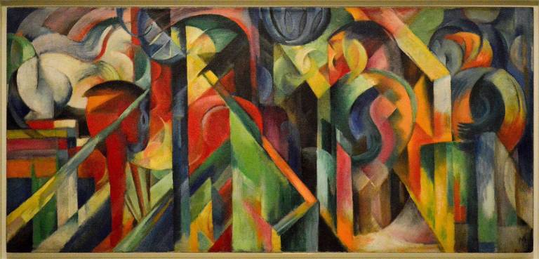 Chagall’s flight of fancy, “Paris through the Window,” depicts dichotomies of inside and outside and fantasy and reality, with a man-faced cat and a train running upside-down in front of the Eiffel Tower. Franz Marc’s rainbow-colored “Stables” beautifully blends architectural shapes with equine grace, and his “Yellow Cow” drew delighted coos from very young and young-at-heart visitors. Modigliani’s portrait of a woman in a yellow blouse and blue skirt seated against a sunlight-sculpted empty wall recalls Vermeer, at the same time reminding us of the vast distances art traveled in the three centuries that separated them.