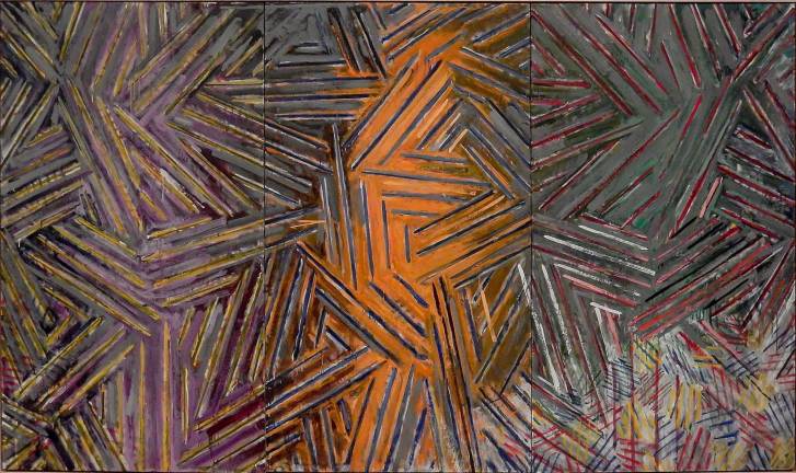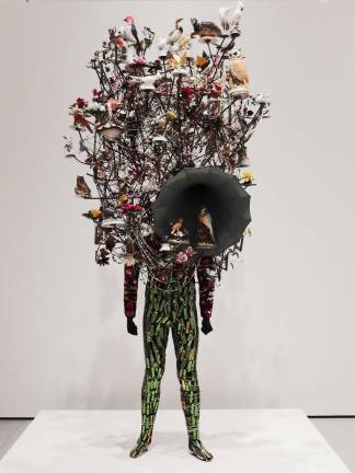 Like the Cone sisters, whose support of Matisse and Picasso was foundational for Modernism, Agnes Gund (Aggie, as she introduces herself in the exhibition’s audio) befriended, collected and championed world-famous artists as well as those just starting out. In the exhibition, major works by iconic 20th century American masters like Ellsworth Kelly, Robert Rauschenberg and Jasper Johns have been intentionally placed in conversation with pieces by less-known contemporary artists. Mona Hatoum is a British artist of Palestinian descent. Her “Pin Rug” made of upward facing straight pins, subverts a familiar form with contradictory, menacing material, and at the same time references the use of rugs and carpets in different cultures. Willie Cole used a steam iron to scorch images onto paper in “Domestic I.D. IV” an allusion to the history of household workers, largely female. Nick Cave’s fantastic “Soundsuit” is worn by a mannequin. Its legs are covered by small green mirrors, while the torso and head present an expansive, swirling assemblage with a gramophone horn and wires holding dozens of porcelain sculptures of birds. Cave, in his statement, explains that his first Soundsuits were created in response to the 1991 police beating of Rodney King — an effort to disguise oneself, to disappear behind a mask. It also hearkens back to a rich history of African masks, sometimes with moveable and auditory components, that often cover the entire body.