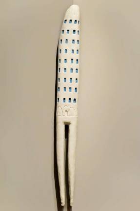 “She loved New York, and she loved the skyscrapers, so many of her images are of buildings and skyscrapers,” said exhibition organizer Deborah Wye, chief curator emerita of prints at MoMA, and a longtime friend of the artist. “She always saw things in personalized terms, so if she saw a skyscraper, she thought of it as a figure. Or two skyscrapers that were near each other were in a relationship.” A painted bronze of tall building with rows of windows topping skinny legs is “Portrait of Jean-Louis,” her son.