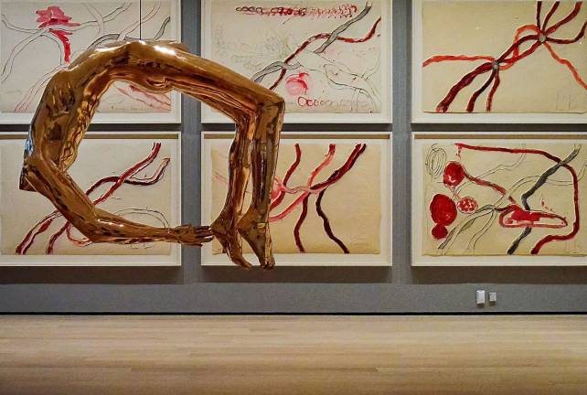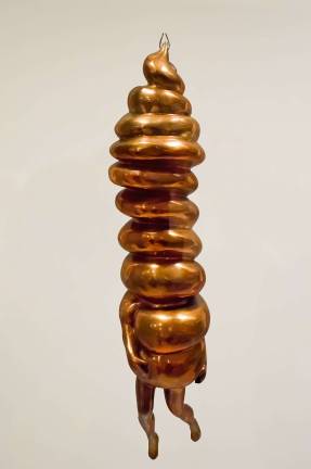 At the center of the gallery is a circle of gold, “Arch of Hysteria,” a life-sized figural sculpture — writhing and agonized, but soaring, transcendent and dazzling.