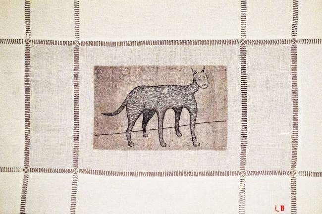 Other recurring imagery includes spirals, reproductive organs, cages, seeds, pods and plants. In the exhibition, they take form in sculptures, drawings, books, prints, etchings, paintings and a delightful group of fiber works made when Bourgeois was in her 80s. Possibly only after her challenging sexual imagery cast in bronze had been accepted and hailed, did she feel comfortable with materials deemed feminine and quaint by an art establishment that devalued the work of many women fiber artists. Whatever the impetus for the works, a human-faced cat printed on a tatted handkerchief (“Self Portrait”) and a series of minimalist sewn, quilted and printed compositions are eye-openers.