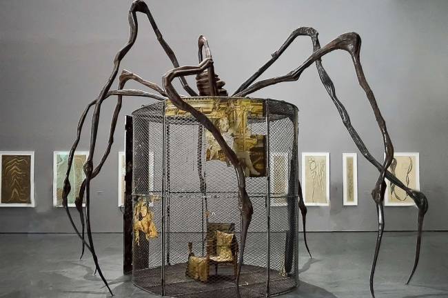 It’s a poignant opener followed by a tour de force. Turning away from the print, one faces “Spider,” from 1997, an enormous cage topped by a gargantuan, spindly-legged arachnoid bronze. The circular cage below the spider is one of a series of 62 “cells” Bourgeois created between 1991 and 2010. Filling the museum’s second-floor atrium, the installation is imposing, constricting and frightening at first glance. On closer inspection, there’s a chair, sections of tapestry, and, hanging from chains, perfume bottles, crystals, a locket with photos, keys and bones tucked inside. It’s a vast and complicated metaphor — as complex and knotty as the artist who created it.