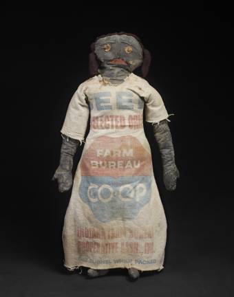 The crafters were mostly Black women who made the dolls for their children, or for the children of the white families they served. The figures were typically passed down from generation to generation and made from scraps and leftover materials—repurposed socks, cloth, leather, metal, coconut shells, bells, buttons, ribbons, bric-a-brac, feed bags, fur, wool, plus cotton, straw and sawdust for stuffing.