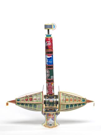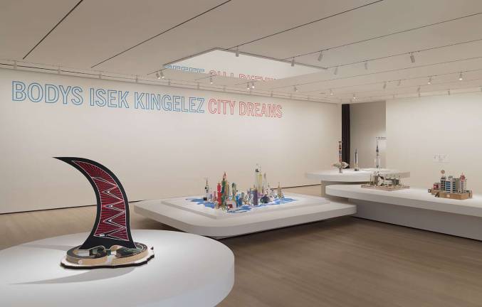 This U.S. first retrospective of Bodys Isek Kingelez (1948-2015), a Congolese artist who created miniature models of fabulously whimsical future cities, is a tonic for modern angst. Visitors will recognize ordinary materials — thread spools, soda cans, corrugated cardboard, bottle caps, ballpoint pen shafts, cardboard tubes and more — transformed into construction materials for fanciful structures: hotels that fan out like peacocks’ tails, a United Nations building with what looks like a Ferris wheel, and entire cities reimagined in bright colors with scalloped edges, festooned with stars.