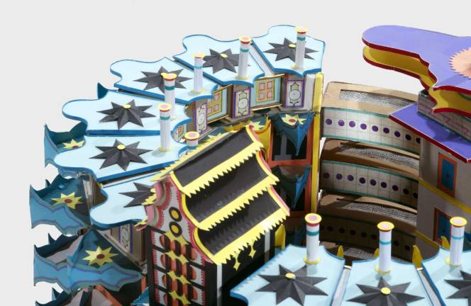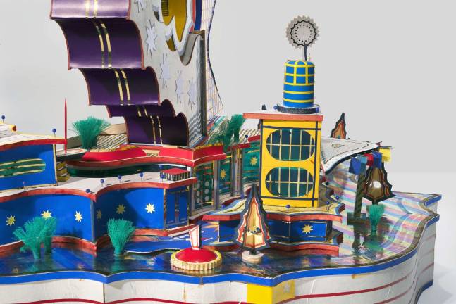 THE WORKSEverything on display combines uplifting optimism and hope about a literally bright future — bursts of yellows and reds, sky blues, deep greens and oranges color his craft — and richly patterned designs. Stars, diamonds, scalloped edges, slides, circles, semicircles, fantastically shaped towers, (he loved skyscrapers) and improbably fan-shaped buildings rise from inventive bases. His “Stars Palme Bouygues” looks ready to take flight. (This work, created during six months in Paris, is his response to the Grande Arche de la Défense, just west of Paris, and Bouygues, the multinational conglomerate that built it.)