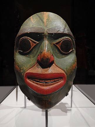 Some of the most stunning works are from the Northwest Coast areas of the U.S. and Canada, where ceremonial objects were understood to express great mysteries and hold great power. A Tlingit mask beautifully illustrates the ambiguous or non-existent boundary between mankind and the natural world. A human face, painted blue, sports a nose that doubles as a beak, when seen from the side. A rattle, also Tlingit, made from abalone, would be used in a healing dance, helping and hoping to realign the individual spirit with a greater spirit. Embracing and revering forms of nature in their coastal villages, Pacific Northwest societies embellished everything from spoons to harpoons and hats with depictions of the creatures around them.