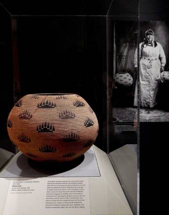 Louisa Keyser, also known as Dat So La Lee (ca. 1829-1925), of the Washoe people in northwestern Nevada, was the Picasso of Native American basketry. Her weaving, utilizing traditional materials and imagery, was exceptionally fine, and she achieved fame in her lifetime. There’s a lovely case featuring her basket bowl, decorated with bear claw designs, and behind it a large photograph of her with the object. Her baskets were so meticulously woven that they were capable of holding water.