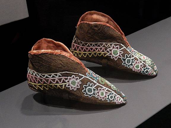 Another delightful combination is a pair of beaded moccasins next to two pouches. Through their designs, they tell stories of world views and values. Through their materials, they tell a story of societal upheaval. A shoulder bag, made by an Ojibwa woman in about 1780 utilizes died porcupine quills pressed flat by the fingernail to weave its geometric patterns, as does a beautiful fire bag, also Ojibwa from about 40 years later. A Muscogee artist from Georgia or Alabama, just 10 years after that, was using glass beads, imported from Europe and traded with settlers, to decorate a pair of hide moccasins.