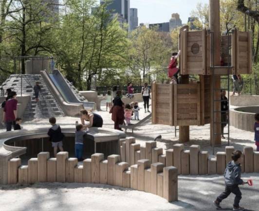 It goes without saying no one playground does it all. There are too many variables, too many styles of play for that to be true, especially in space as constrained as Manhattan. So while many kids consider jungle gyms, monkey bars, climbing ropes, slides and the like essential, there is another way, and Adventure is its name-o. In this case, the word is both a proper name and a concept. Instead of a playground featuring some or all of the aforementioned standard features, an adventure playground creates a unique, exploratory landscape. In this case, Adventure Playground, designed by architect Richard Dattner, offers a wondrous fortress-looking array of wood objects, walls, climbing structures, a conical pyramid-like slide and tunnel. Remarkable!
