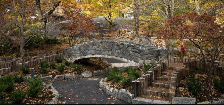 This unique playground eschews traditional swings and jungle gyms in favor of structures that mimic in miniature the surrounding park. A little stone bridge, a log maze and and a timber-log swing set are just a few of the features that make the park ideal for creative play and imaginative games. Don’t miss the hidden water fountain; children can press a button that causes water to spring from the ground in the tiled mosaic area.