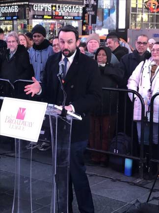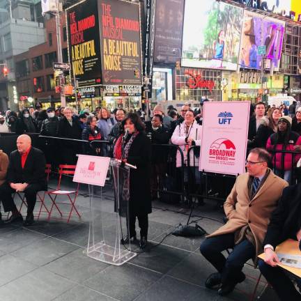 “It’s a great honor to be standing here. It was not too long ago we were begging people to come to see Broadway plays,” said NYC Councilman Keith Powers, the Democratic majority leader whose district includes the East Side of the Theater District. “Our city depends on you guys,” he said to the teachers.