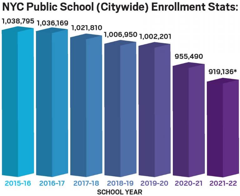 Fewer and fewer kids are being enrolled in the city’s public schools, a trend that started years before the pandemic — but only intensified during COVID-19’s reign. The number dropped every year since the 2015-2016 school year, when 1,038,795 students were enrolled, data from the New York City Independent Budget Office shows. By the 2021-2022 academic year, that number had dropped to 919,136, a Department of Education spokesperson told Our Town.