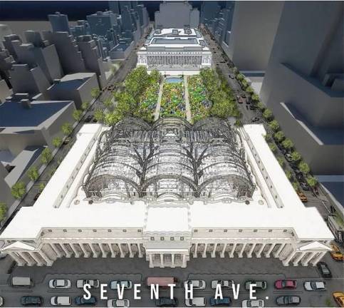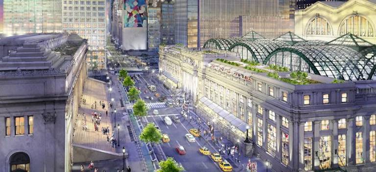 2. ReThinkPennStationNYC would also remove The Garden and office buildings and goes even further in rebuilding the original Pennsylvania Station, “with modifications for current technologies and capacity needs,” Turvey said. “We are open to park land and have advocated for it in the past but want to make sure the above ground station can handle the capacity needs of the station first.” The plan also calls for a reimagined façade on eighth avenue to reflect how much the city has moved west since the original.