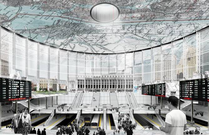 1. Grand Penn Community Alliance would tear down the current Madison Square Garden and two office buildings and rebuild the train hall of the original Pennsylvania Station along Seventh Avenue for use by modern day commuters. “The bones are there for something beautiful and functional that can serve as the center of a new mixed-use neighborhood.” Between this new train hall and the Moynihan Train Hall for Amtrak would be a park (similar to Bryant Park behind the New York Public Library) with skylights above the boarding concourses. “It all works together as a whole,” said Alexandros Washburn of the Alliance.
