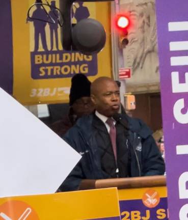 Mayor Eric Adams was among the politicos who turned up and gave a speech. “We are saying to the Realty Advisory Board...let’s get it right, let’s do what’s right, let’s give 32BJ SEIU a standing-together fair contract,” he said.