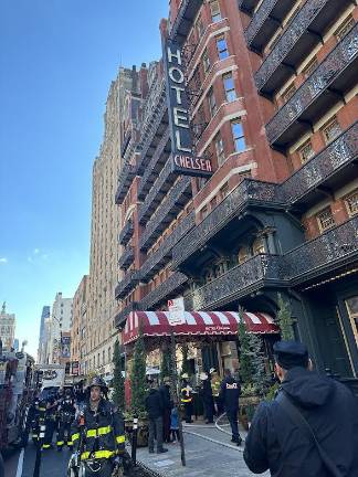 Pedestrians and local business workers hoping to get a peek at the action, crowded around the hotel, a one time bohmenian hangout which had been a favorite of literary, music and artistic icons over the years including Mark Twain, Dylan Thomas, Andy Warhol, Bob Dylan, Mick Jagger and Sid Vicious. Pete Hamill stayed there during his short run as editor in chief of the Daily News in 1997 and so did Madonna in the early 1980s returning in the 1990s to shoot portions of her 1990s book “Sex.” So did Arthur C. Clarke who wrote “2001: A Space Odyssey” while residing at the Chelsea. Playwright Arthur Miller (“Death of a Salesman”) and actress Jane Fonda all spent time there.