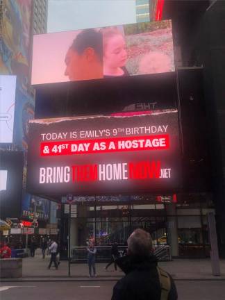 ”It’s her birthday and she is not here,” said Thomas Hand, who was in Times Square on Nov 17 gazing at an LED billboard which sponsored by Bringthemhomenow.net. The billboard at the intersection of Seventh Ave, Broadway and 47th St. –the crossroads of the world–featured the words: “Today is Emily’s 9th Birthday & 41st Day as a hostage. Bring Them Home Now.”