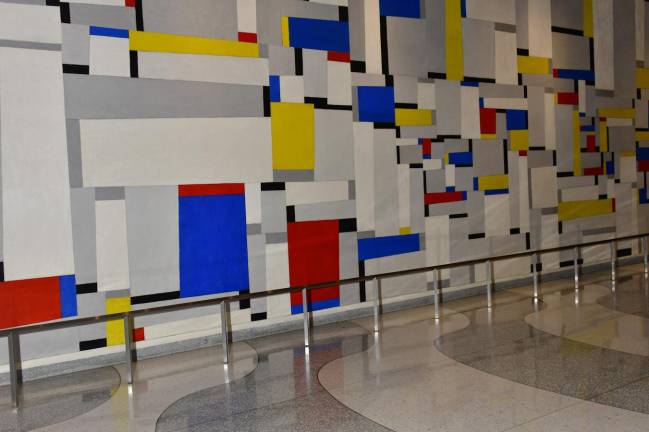 The lobby also features a striking Mondrian-esque mural in red, yellow, blue, and white by Swiss-born artist Fritz Glarner (Relational Painting No. 88), and another enormous geometric mural, Two Portals by Josef Albers. The City of New York designated the lobby a city landmark in 2002, but it is staffed by diligent security guards who will shoo you out if you linger too long!