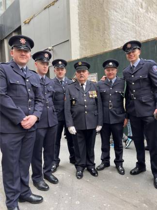 Bob Poneel, a retired Lt. from Engine 225 in Brooklyn, had been at the World Trade Center on 9/11 and was once again decked out in full dress uniform, trying to keep the younger guys in line. Looking at the flags as the FDNY shaped up on west 47th St. he remarked, “It’s a privilege and an honor to be carrying one of those flags.”