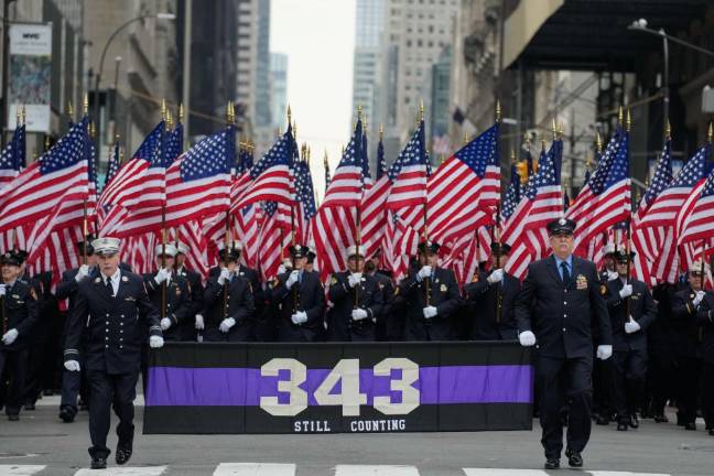 In front of the flagbearers a banner of black and purple bunting with the number 343 and the words, “still counting” as a reminder that so many of the men who dug on the pile at the WTC for months afterwards are now dying of 9-11 related illnesses. Beyond the firefighters was another banner for families of 9-11 victims. One held a sign in memory of his father. “I was two years old when he died,” the hand held sign read.