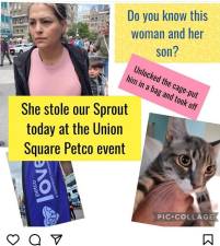 A kitten named Sprout was stolen--allegedly by the woman above (left)--from a display being run by pet rescue operation Fabulous Feline. The theft went down during the Petco opening day festivities at Union Square. Photo: Fabulous Feline Instagram ( Photo via fabulousfelineinc on Instagram ) Kitten Stolen During Petco HQ Opening At Union Square...Cat Burglars Remain At Large A months-old kitten being put up for adoption was craftily stolen from its cage in Union Square on Sunday, June 4th, during... News Alert 09 Jun 2023 | 10:52