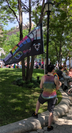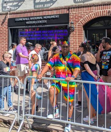 Back down at Sheridan Square, in front of the Stonewall Inn, a jovial black man from Massachusetts dressed in rainbow shorts, rainbow socks, a rainbow shirt, and rainbow crown, patiently awaited the parade’s arrival.