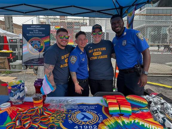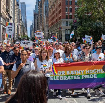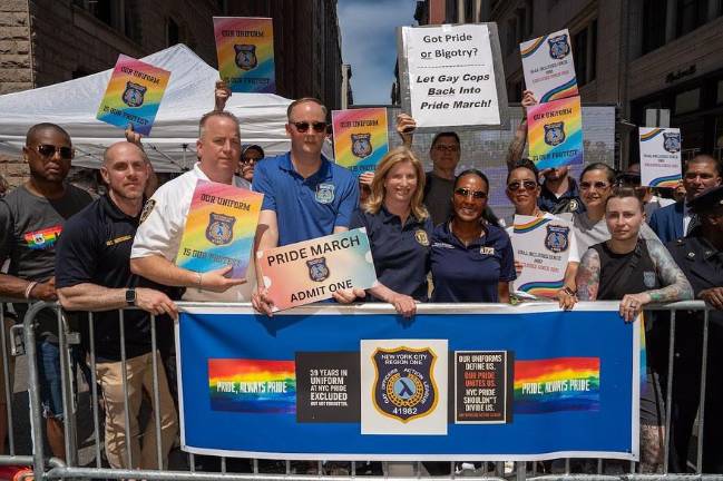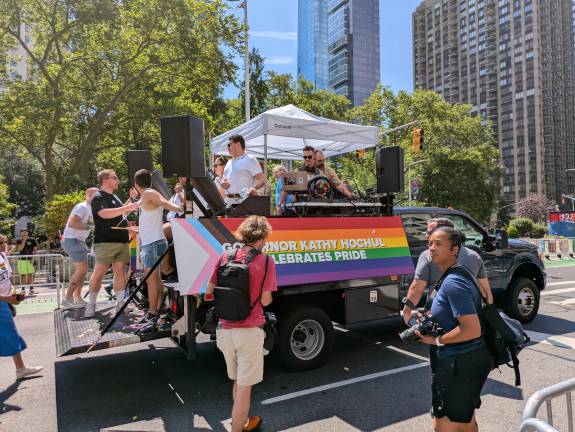 With police banned from the main Pride parade, the line of march began not with cops on motorcycles or horses but with the music-blaring, confetti-blasting campaign truck of Governor Kathy Hochul, who was earlier among the numerous Manhattan pols who posed with members of the Gay Officers Action League.