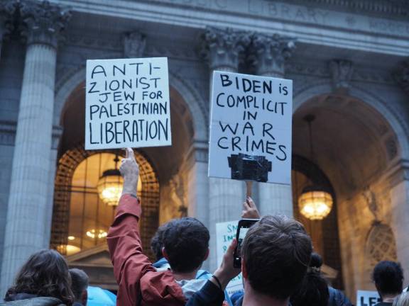 “I am with you today as an American Jew, with my whole heart broken at the genocide that is being carried out in the name of Jewish safety with the full support of the United States government,” Morgan Bassichis, a leader of the New York chapter of Jewish Voice for Peace, yelled through a megaphone from the steps of the library. “We will not let Jewish pain and Jewish fear and Jewish grief be weaponized to justify the collective punishment of Palestinians, to justify the genocide of Palestinians in Gaza.”