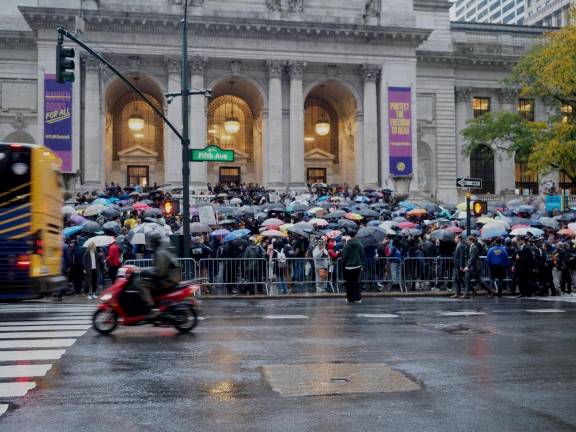 Thousands of people gathered outside of the New York Public Library on Fifth Avenue at 5 p.m. on Oct. 20, waving Palestinian flags and signs that said “anti-war = anti-apartheid” and “let Gaza live,” and chanting “free Palestine” and “cease-fire now” to the beat of a pounding drum. They were demanding an end to Israeli bombardment in Gaza.