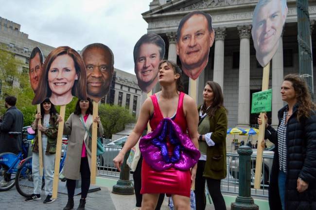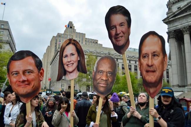 When a procession of larger-than-life cutouts of six Supreme Court justices’ faces bobbed over a crowd of thousands in Foley Square on Tuesday, protesters swarmed. Then, they cursed the cardboard doppelgangers out.