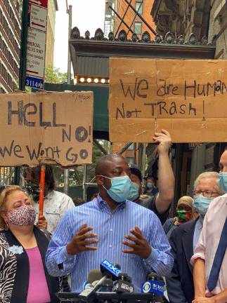 Over the weekend, protesters flocked to the Lucerne and Harmonia shelters, joined by an array of elected officials from the West and East Sides, including Manhattan Borough President Gale Brewer, State Senators Liz Kreuger and Brian Benjamin, Assembly Members Dick Gottfried and Linda Rosenthal, and City Council Members Keith Powers and Helen Rosenthal.