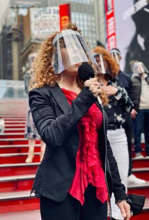 Broadway Inspirational Voices, with special guests, sang a socially distanced ensemble performance of Stephen Sondheim’s “Sunday” from “Sunday in the Park With George” on the TKTS Red Steps.